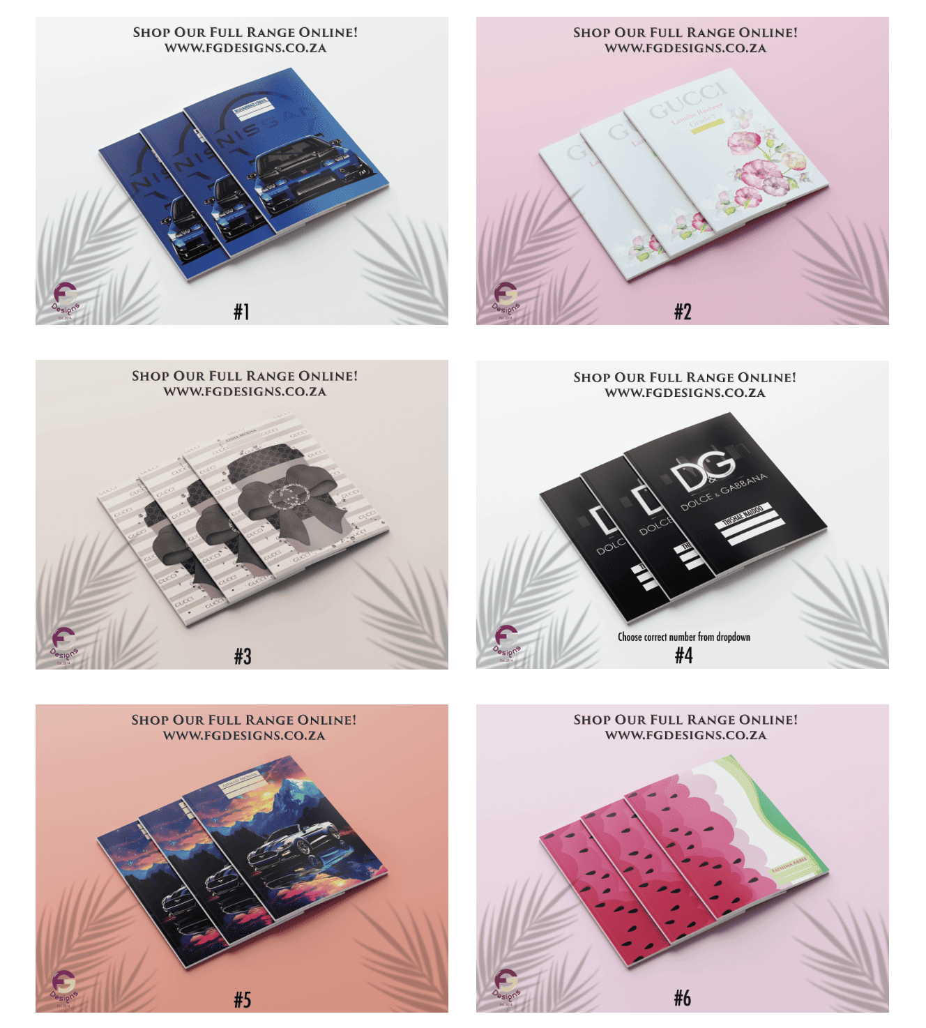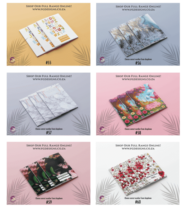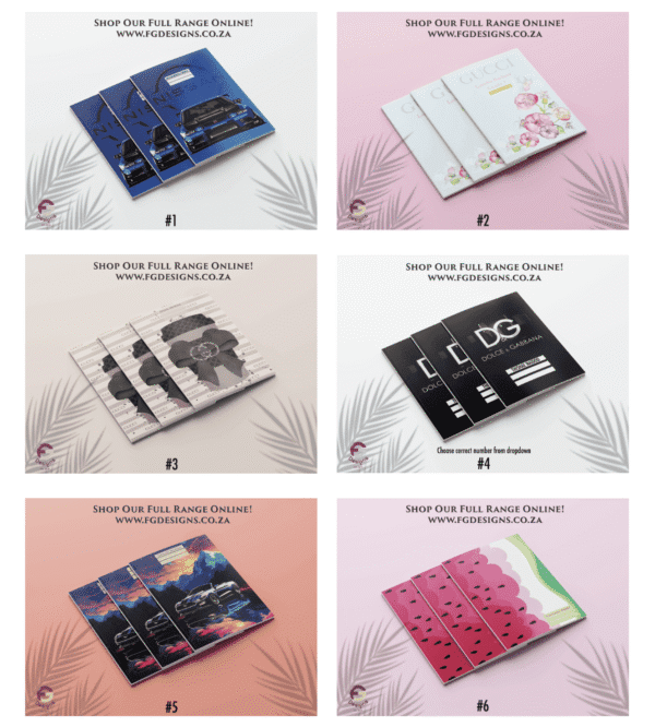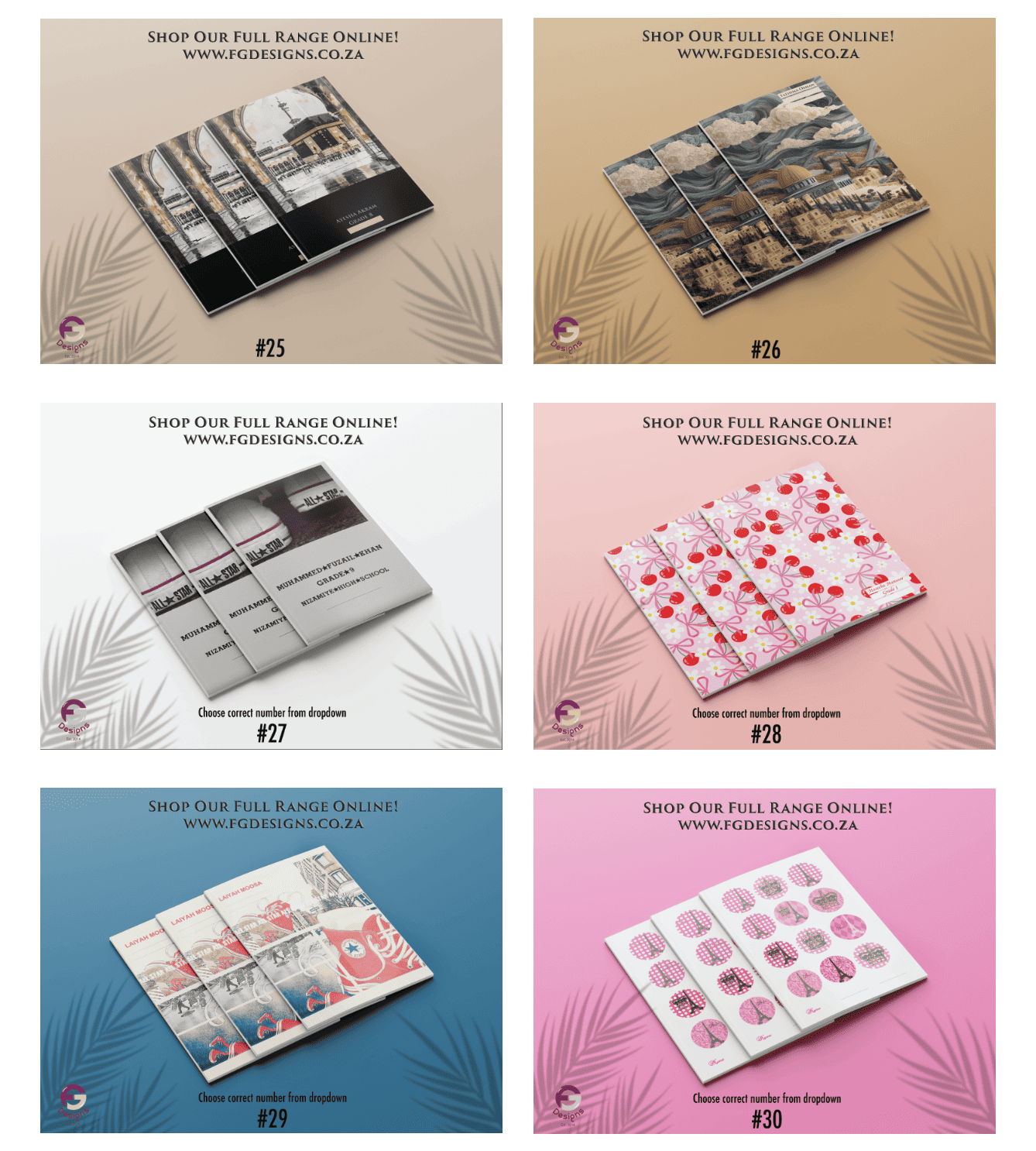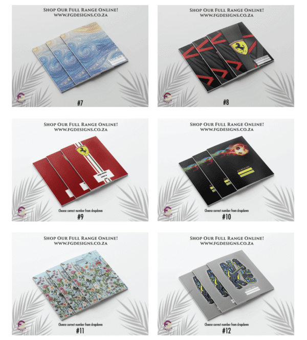1 – Nissan, 2 Pastel Gucci (Light Blue), 3 Gucci Coffee, 4 Dolce & Gabbana, 5 Mustang Mountains, 6 Watermelon Design, 7 Glitter Swirls, 8 Ferrari Black and Red, 9 Ferrari (Red), 10 Soccer Ball (Flames), 11 Tiffany Blue Floral Garden, 12 Nike Blue Yellow Grey, 13 Gucci Multicolour, 14 Porsche GTS, 15 Teal Turqoise Stain Glass, 16 Dome of the Rock, 17 Boss Orange, 18 Lamborghini (Blue), 19 Gucci (Light Pink), 20 Pink Moroccan Pattern, 21 Jimmy Choo (Heels), 22 Hugo Boss, 23 Gucci Floral (White), 24 Tropical + Marble, 25 Kabah, 26 Dome of the Rock Starry Night, 27 All Star (Grey), 28 Cherry Bow, 29 Converse All Star, 30 Eiffel Tower (Crown), 31 Donut Worry, 32 All Star / Vans, 33 Palestine Flag Rose, 34 Pastel Glass Swirls, 35 Don't Stress, 36 You're Amazing, 37 Watermelon Hearts, 38 My Success is only by Allah, 39 Daily Dhikr, 40 Jimmy Choo (Hand Drawn), 41 On Wednesdays…, 42 You Got This, 43 Gold Flowers Pastel, 44 Mean Girls (Pink), 45 Mercedes + Plane, 46 Dolce & Gabbana Purple Floral, 47 Journal, 48 Mean Girls (Pink & White), 49 Life is Sweeter, 50 Love Pink, 51 Start with Bismillah, 52 Astronaut, 53 I Stand With Palestine, 54 Good Vibes, 55 ABC, 56 Marble, 57 Marble + Rose, 58 Enchanted Garden, 59 Gucci Butterfly, 60 Dolce & Gabbana Floral, 61 Adidas Marble, 62 Adidas Clouds, 63 Adidas Sky, 64 Marble Glitter, 65 Glitter Splatter, 66 Glitter White Marble Ombre, 67 Rose Gold Glitter Chevron, 68 Glitter Black Marble Ombre, 69 Glitter Ombre, 70 Racing Car, 71 Autumn Leaves, 72 Pastel Haram, 73 Wet Paint Pastel Flowers, 74 Floral Geometric, 75 Boss Handdrawn, 76 Hawaii Vibes, 77 Watercolour Flowers, 78 Blue & Gold Hexagons, 79 Direction Signs, 80 Carpe Diem, 81 Dubai Burj Khalifa, 82 Burj Khalifa Lights, 83 Burj Khalifa Multicolour, 84 Burj Khalifa Sky, 85 Burj Al Arab Multicolour, 86 Watercolour Maroon, 87 Bora Bora, 88 Inspiration, 89 Blue Flowers, 90 Glitter Leopard Print, 91 Glitter Flow, 92 Rose Gold Floral Pattern, 93 Floral Heel, 94 Sea & Flowers, 95 Watercolour Eiffel Tower, 96 Pink + Purple Eiffel Tower, 97 Eiffel + Bow, 98 Pink Damask, 99 Shells & Oysters, 100 Houndstooth, 101 Successful Woman, 102 Gucci Blue Floral, 103 Blue Flowers, 104 Blue and Cream Circles, 105 Mint + Marble, 106 LV Stripes, 107 Pretty Flowers, 108 The Right Side, 109 Spaceships, 110 Gucci Pink & Yellow, 111 BMW Driving Pleasure, 112 Cars & Trucks, 113 Gucci Floral, 114 LV Inspired Grey/White Stripes, 115 Marble/Rose Gold/Pink, 116 Hot Wheels, 117 Rainbow Glitter Stripes, 118 Blue VW, 119 Parked Cars, 120 Marble/Grey, 121 Floral/Pink, 122 Gucci Black, 123 Hand Drawn Gucci, 124 Loewe Stripes, 125 Lamborghini/Yellow, 126 Porsche Carrera, 127 Blue Swirls, 128 Black/Grey Marble/Pink, 129 BMW Motorrad, 130 Stars, 131 SubhanAllah Alhamdulillah AllahuAkbar, 132 Stripes/Pink, 133 Toy Story, 134 Paw Patrol, 135 Pink Aztec Pattern, 136 Harry Potter 9 3/4, 137 Gryffindor, 138 Floral Garden, 139 The Muggle Struggle, 140 Slytherin, 141 Hogwarts, 142 Burn Book, 143 Friends (Black), 144 Friends (White), 145 Watermelon, 146 Aston Martin, 147 Colourful Doodles, 148 Watercolour Flowers, 149 Thank u Next, 150 Pastel Scales, 151 Pastel Dunes, 152 Grid Lines, 153 Pink Flowers, 154 Glitter Leopard Print, 155 Turq/Brown Swirl, 156 Glitter Waves, 157 Henna Designs, 158 Monochrome Stars, 159 Pastel Stripes & Hearts, 160 Pastel Stripes & Circles, 161 Chelsea Football Club, 162 Chelsea KTBFFH, 163 Pastel Marble, 164 Green Leather, 165 Brown Leather, 166 Leopard Print Glitter, 167 Spiderman, 168 Hustle, 169 Chloe, 170 Galaxy, 171 Spiderman, 172 City Silhouettes, 173 Handpainted Flowers, 174 Light Pink Tulips, 175 Powder Painting, 176 Watercolour Floral Painting, 177 Yellow Lamborghini, 178 BMW Racing, 179 BMW M2, 180 Superheroes, 181 DBZ, 182 M3, 183 I'd Rather Be Playing Padel, 184 Gucci Butterfly Floral, 185 Purple Flowers, 186 Pink Flowers, 187 Pastel Flowers, 188 Turquoise, 189 Sea and Sand, 190 Flowers & Polka Dots, 191 Pastel Space, 192 Flowers and Stripes, 193 Vintage Flowers, 194 Rolls Royce, 195 Gucci Butterfly, 196 Gucci Tulips, 197 Flowers & Gems, 198 Maroon & Green Flowers, 199 Green Squares, 200 Nike Paint